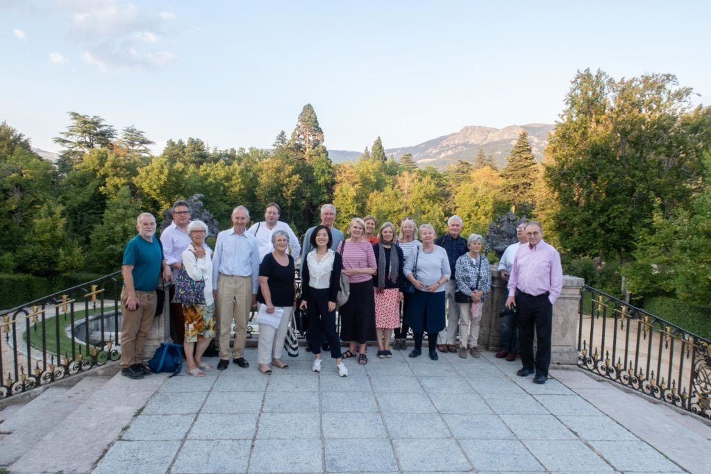 17 attendees of the OCS Visit to Madrid in front of some railings smiling at the camera. Trees and green hills in the background